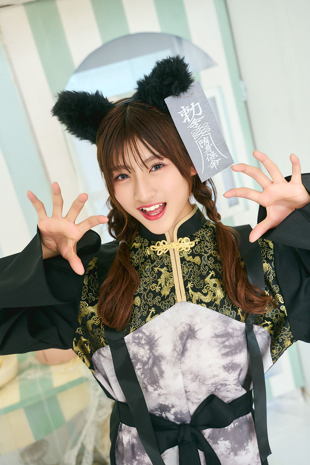 ジュニア向けコスチュームブランド「COSCHU!」キョンシー×オオカミ×ゾンビをテーマにした新しいデザイン大きなオオカミ耳が付いたカチューシャはふわふわの長毛ファーを使用。 トップスはオリジナルの汚れプリントに、黒×ゴールドの本格的なチャイナ生地を掛け合わせました。 チャイナ釦とルーズな長めの袖もポイント。 更に腰紐は前後どちらでも結べる2WAY仕様。 お手持ちのボトムスと合わせるだけでお手軽にハロウィン仮装が完成します。 またユニセックスサイズでゆったりとしたシルエットなので男性も着用でき、女性はオーバーサイズの着こなしをお楽しみいただけます。 ハロウィン、撮影イベントなどさまざまなシーンで活躍します。 |