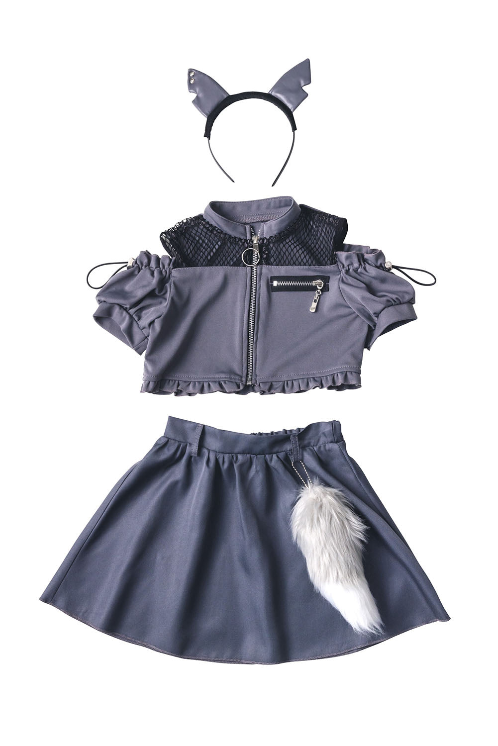 K-POP×スポーティーな最旬オオカミ♡お腹見せでエネルギッシュにキメて!人気のK-POPダンス要素とスポーティーをMIXしたカジュアルスタイル。 チャコールグレー×ブラックの配色にカチューシャは合成皮革素材、オオカミの耳にリング状のハトメ、そしてセパーレートタイプでお腹見せと強めでエネルギッシュなイメージ。 スポーティー要素として首まわりのメッシュ生地やオープンファスナー、袖のスプリングストッパーなどを取り入れました。 ウエストにはファーのしっぽ付き。 トップスの素材はストレッチ生地を使用し、カチューシャは頭が痛くなりにくいよう細めの芯を使用しました。 ハロウィンはもちろん、撮影会やイベントにもぴったりです。 |